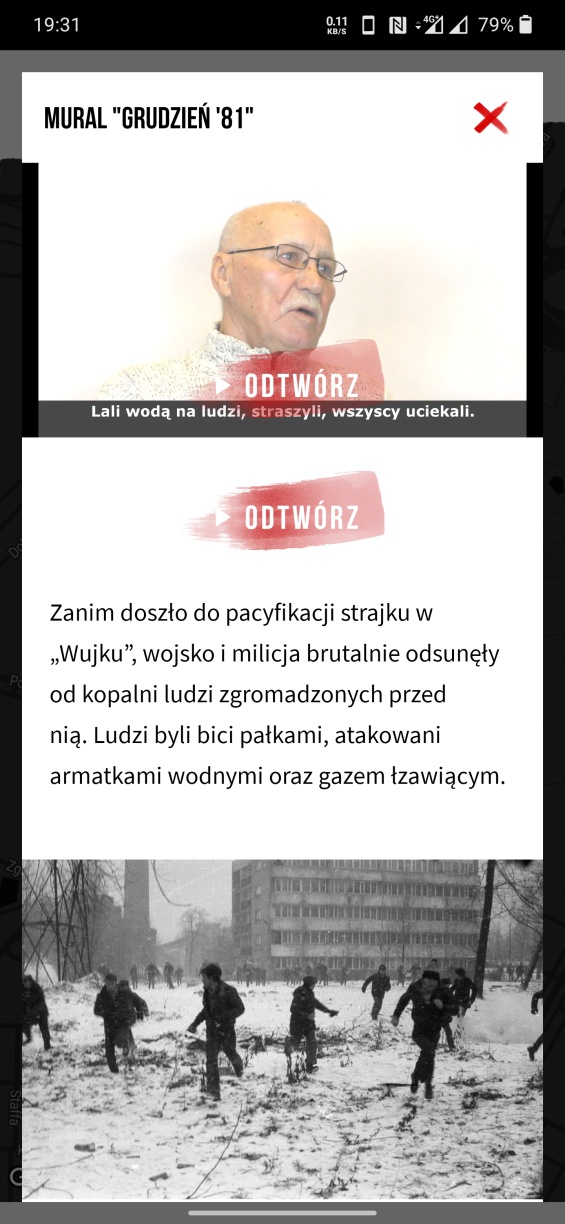 Aplikacja jest przewodnikiem po miejscach w okolicy Kopalni „Wujek”, które związane są z pacyfikacją zakładu w 1981 r.