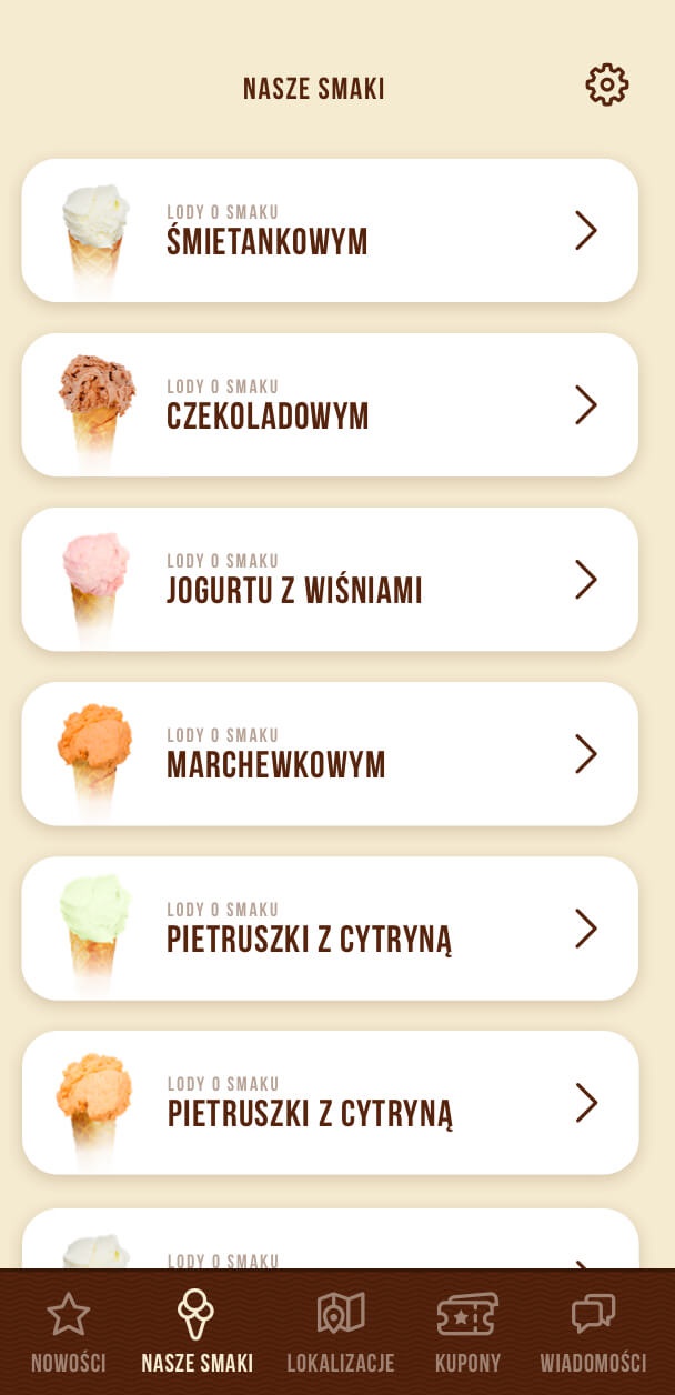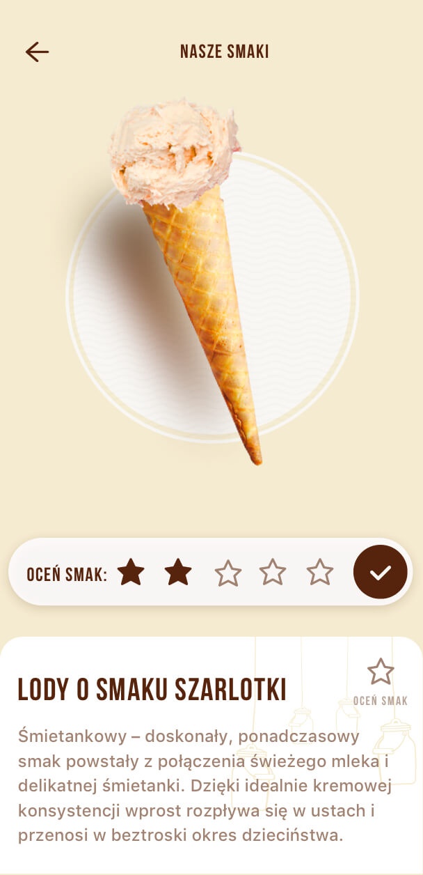 Użytkownik ma możliwość zapoznania się z ofertą wytwórni i aktualnościami. Moduł kuponów pozwala skorzystać z licznych rabatów, a dzięki mapie lodożerca znajdzie najbliższą lodziarnię.